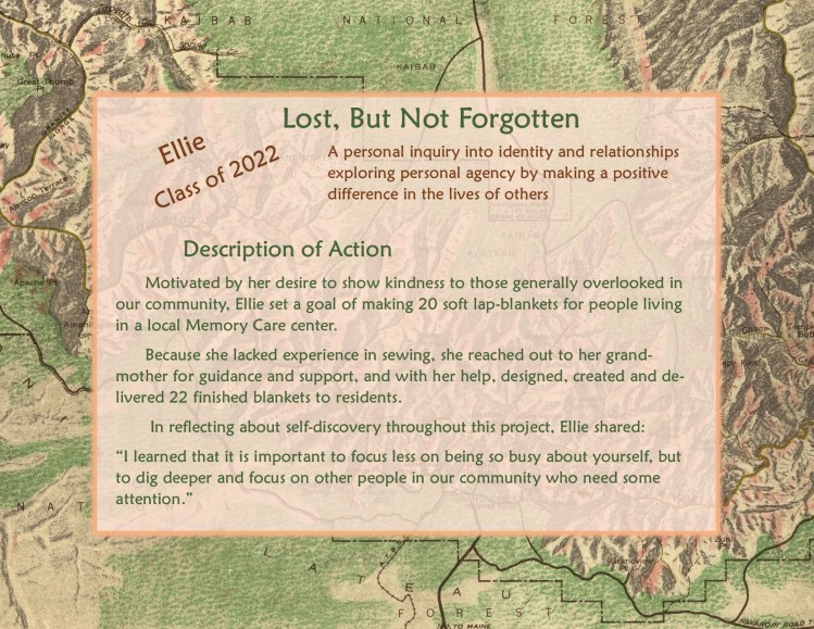 Given unlimited choice regarding personal project topics, Ellie quickly decided on something service-oriented, selecting residents at a local Memory Care center as the recipients of her efforts. With her grandmother’s guidance, Ellie learned the basics of operating a sewing machine and used it to make 22 lap-blankets of various colors and shapes, each one ultimately presented to someone she had never met before.